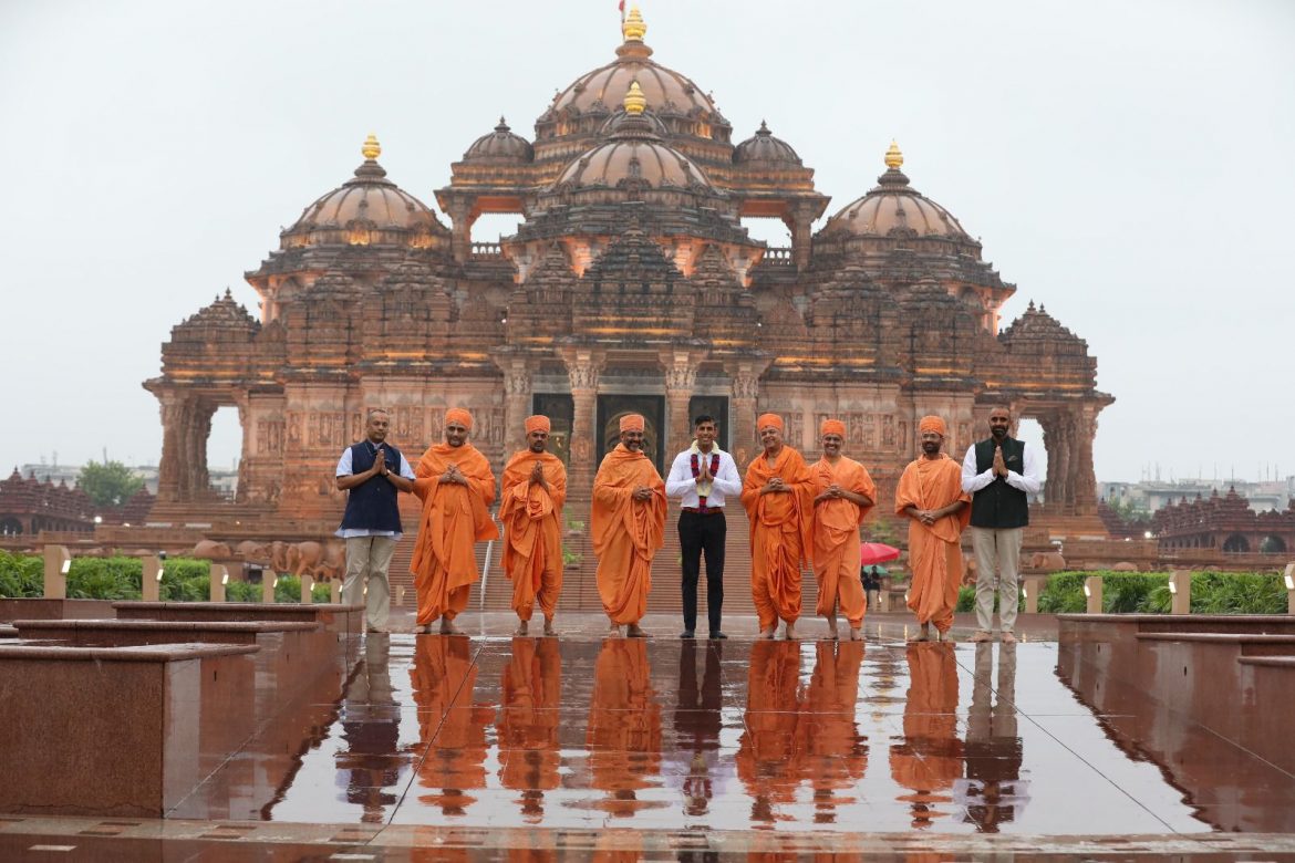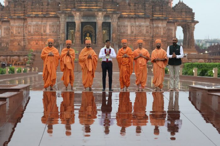 જી20 શિખર સમ્મેલનના બીજા દિવસે બ્રિટનના વડાપ્રધાન ઋષિ સુનક આજે દિલ્હીમાં અક્ષરધામ મંદિર પહોંચ્યા હતા. ઋષિ સુનકે તેમના પત્ની અક્ષતા મુર્તિ સાથે સ્વામીનારાયણ ભગવાનના દર્શન કર્યા હતા.