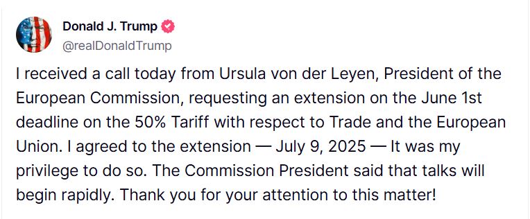 પ્રેસિડેન્ટ ટ્રમ્પનું કહેવું છે કે યુરોપિયન યુનિયન આયોગના અધ્યક્ષ સાથે વાત થઈ, જેમાં તેમણે યુરોપિયન યુનિયન પર 50 ટકા ટેરિફ લગાવવાની ડેડલાઈન 1 જૂનથી આગળ ખસેડવાનો આગ્રહ કરાયો હતો. ટ્ર્મ્પે વધુમાં કહ્યું કે તેમના આગ્રહને માનીને તને 9 જુલાઈ, 2025 સુધી ટાળી દેવામાં આવ્યો છે. આ એ તારીખ છે કે જ્યારે ભારત સહિત વિશ્વના દશો પર રેસિપ્રોકલ ટેરિફ લાદવામાં આવ્યો હતો.