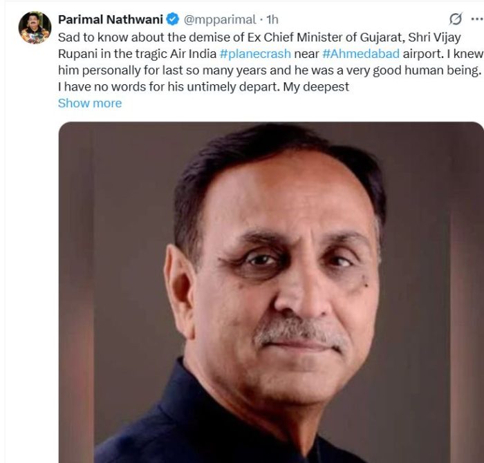 રાજ્યસભાના સાંસદ પરિમલ નથવાણીએ ગુજરાતના પૂર્વ સીએમ વિજય રૂપાણીના નિધનના સમાચાર મળતાં ટ્વીટ કરીને દુઃખ વ્યક્ત કર્યું હતું. જાણવા મળ્યા મુજબ વિજયભાઈ રૂપાણીના પત્ની અંજલિબહેન લંડનથી અમદાવાદ આવવા રવાના થઈ ગયા છે, તેઓ કાલે શુક્રવારે બપોરે 1 વાગ્યાની આજુબાજુ અમદાવાદ પહોંચશે.