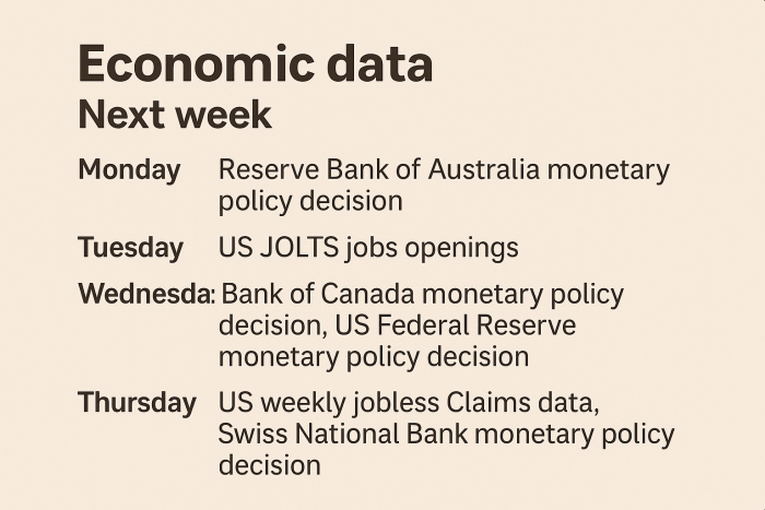 ટૂંકમાં આગામી સપ્તાહ ખૂબ અનિશ્ચિતતાવાળું રહેશે અને ભારે વધઘટ પણ જોવા મળી શકે છે. જેથી સાવચેતી રાખવી વધુ જરૂરી છે. યુએસ ફેડની સાથે સોમવારે રીઝર્વ બેંક ઓફ ઓસ્ટ્રેલિયાની મોનેટરી પૉલીસીની બેઠક મળનાર છે. બુધવારે બેંક ઓફ કેનેડાની મોનેટરી પૉલીસી અંગે બેઠક મળશે તેમજ ગુરુવારે સ્વિસ નેશનલ બેંકની મોનેટરી પૉલીસીની બેઠક મળશે. એટલે આગામી સપ્તાહ અતિમહત્ત્વનું બની રહેશે.