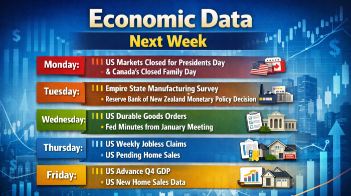આગામી સપ્તાહના સોમવારે યુએસ પ્રેસિડેન્ટ ડે હોવાથી યુએસના માર્કેટ બંધ રહેશે. કેનેડામાં ફેમિલી ડે હોવાથી ઈક્વિટી માર્કેટ બંધ છે તેમજ ચીનમાં લુનાર ન્યૂ યર હોવાથી બજારો બંધ રહેશે. આથી આગામી સપ્તાહે ચાર વર્કિંગ ડેનું સપ્તાહ છે.