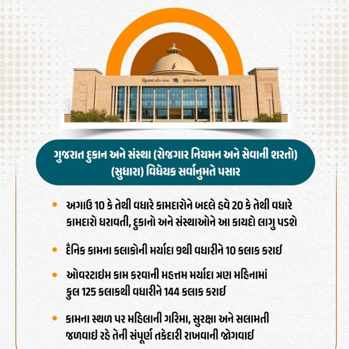 ગાંધીનગર- Gujarat Assembly 2026 ગુજરાત વિધાનસભા ગૃહમાં શ્રમ અને રોજગાર પ્રધાન કુંવરજીભાઈ બાવળીયા દ્વારા રાજ્યપત્રમાં અગાઉ પ્રસિદ્ધ થયેલા ગુજરાત દુકાન અને સંસ્થા (રોજગાર નિયમન અને સેવાની શરતો) અધિનિયમનું સુધારા વિધેયક આજે રજૂ કરવામાં આવ્યું હતું. જેને ગૃહના સભ્યો દ્વારા સર્વાનુમતે પસાર કરવામાં આવ્યું હતું. શું છે આ વિધયક અને તેમાં શું સુધારા કરવામાં આવ્યા છે?(Gujarat Shops and Institutions Amendment Bill passed unanimously, what amendments were made in this bill?) તમામ હકીકત જાણો….