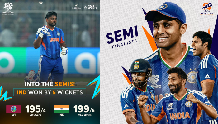 ભારત સંજૂ સૈમસન નોટ આઉટ 97 રન બનાવ્યા તેના દમ પર વેસ્ટઈન્ડિઝને 5 વિકેટે હરાવી દીધું છે. અને ટી20 વર્લ્ડકપ સેમીફાઈનલમાં પ્રવેશ કરી લીધો છે. હવે સેમીફાઈનલ 5 માર્ચે ઈગ્લેન્ડ સામે ભારત મુંબઈમાં ટકરાશે. સંજૂ સૈમસન આજની ભારતની જીતનો હીરો બની ગયો છે. ભારત છઠ્ઠી વખત ટી20 વર્લ્ડકપ સેમીફાઈનલમાં પ્રવેશ કર્યો છે.