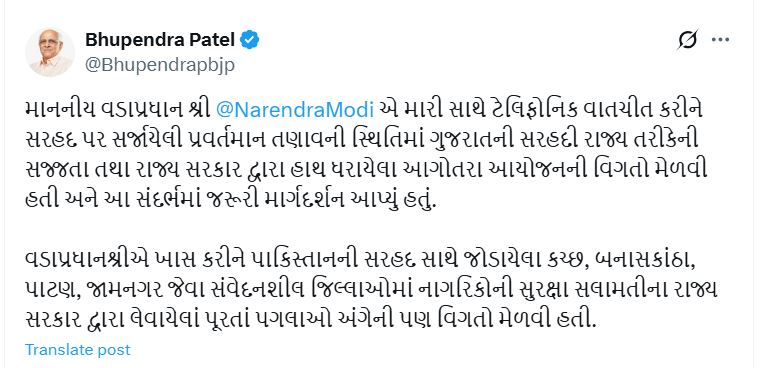 સીએમ ભૂપેન્દ્ર પટેલે ખાસ કરીને સરહદી વિસ્તારો કે ગામોમાં કોઈપણ સંદિગ્ધ ગતિવિધિઓ, શંકાસ્પદ વસ્તુઓ કે વ્યક્તિઓ વિશે માહિતી મળે તો તુરંત જ તંત્ર એલર્ટ મોડ પર રહીને તત્કાલ કાર્યવાહી કરે તેમ સ્પષ્ટપણે જણાવ્યું હતું. આર્મી, એરફોર્સ, નેવી, કોસ્ટ ગાર્ડ, BSF અને અન્ય કેન્દ્રીય એજન્સીઓની સતર્ક કામગીરીની સરાહના કરતાં તેમને જરૂરીયાત મુજબની મદદ રાજ્ય સરકાર દ્વારા ત્વરાએ મળશે તેવી ખાતરી આપી હતી.