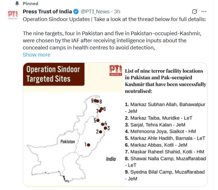 અમદાવાદ– પહેલગામ આતંકી હૂમલા પછીના પંદર દિવસ પછી ભારતે પાકિસ્તાન ( India Pakistan ) અને પીઓકેના ( POK ) આતંકવાદીઓના નવ કેમ્પ પર એરસ્ટ્રાઈ કરી છે. ( India’s airstrike on Pakistan ) આ સ્ટ્રાઈક પછી પાકિસ્તાનમાં જબરદસ્ત ગભરાટનો માહોલ છે. ( Operation Sindoor ) ભારતીય સેનાએ જણાવ્યું છે કે તેમણે પાકિસ્તાનમાં કયા કયા સ્થળો પર સ્ટ્રાઈક કરીને નિશાન તાક્યું છે. આ સમગ્ર માહિતી વાંચો…