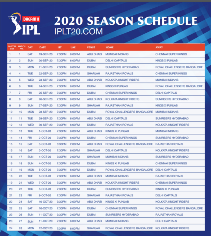આઈપીએલ 2019ની વિજેટતા ટીમ મુંબઈ ઈન્ડિયન્સનો સામનો 19 સપ્ટેમ્બરે પહેલી મેચમાં પાછલા વર્ષે ઉપવિજેતા ચેન્નઈ સુપર કિંગની સાથે થશે. પહેલી મેચ ભારતીય સમય પ્રમાણે સાંજે સાડા સાત વાગ્યે શરૂ થશે. જ્યારે ટોસ 7 વાગ્યે ઉછાળવામાં આવશે. આ પ્રથમ મેચ અબુધાબીમાં રમાશે. બીજી મેચ રવિવારે 20 સપ્ટેમ્બરના રોજ દિલ્હી કેપિટલ્સ અને કિંગ્સ ઈલેવન પંજાબની વચ્ચે દુબઈમાં રમાશે. આઈપીએલ 2020ની સીઝનનો ફુલ શિડ્યુલ નીચે મુજબ છે.