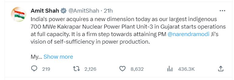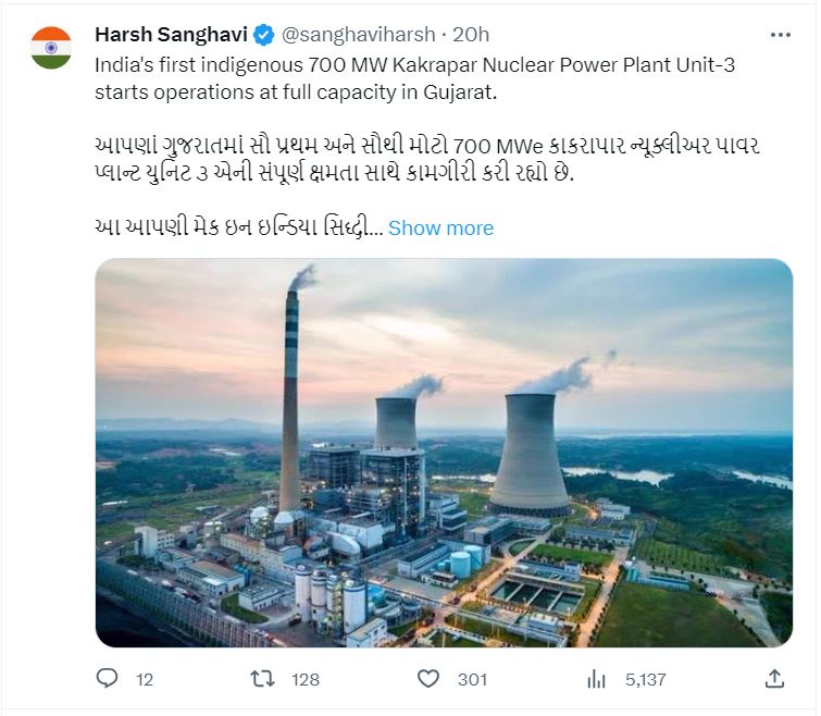 હર્ષ સંઘવી, ગૃહ વિભાગ, સરકાર ગુજરાતે પણ ટ્વીટ કર્યું છે કે “ભારત ના કાકરાપાર ન્યુક્લિયર પાવર પ્લાન્ટ યુનિટ-3 ગુજરાત માંપ્રથમ સ્વદેશી 700 મેગાવોટ ની સંપૂર્ણ ક્ષમતા સાથે કામગીરી શરૂ કરેલ છે”.