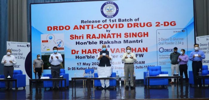 કોરોના સંક્રમિત દર્દીઓ માટે ડીઆરડીઓની નવી દવા 2DG (2-deoxy-D-glucose)ના 10 હજાર ડોઝ આજે સોમવારે કેન્દ્રીય સંરક્ષણપ્રધાન રાજનાથસિંહ અને કેન્દ્રીય આરોગ્યપ્રધાન હર્ષવર્ધને લોન્ચ કર્યા છે. ત્રણ ટ્રાયલ પછી પહેલી મે, 2021ના રોજ ડીસીજીઆઈ તરફથી ઈમરજન્સી ઉપયોગની મંજૂરી મળી ગઈ છે. પાવડરના રૂપમા આ ડ્રગ એક બોટલમાં અપાશે, જે પાણીમાં મેળવીને લેવાનું છે. આ દવા કોરોના સંક્રમિત કોશિકાઓ સુધી જઈને વાયરસની વૃદ્ધિને રોકવામાં સક્ષમ છે.