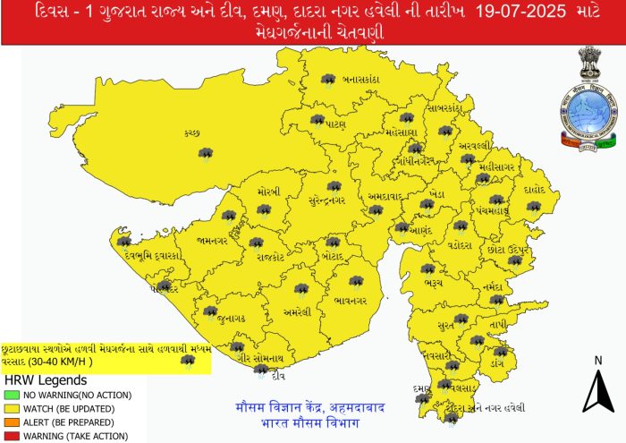 રાજ્યના મોરબી, સુરેન્દ્રનગર, જામનગર, દેવભૂમિ દ્વારકા, રાજકોટ, પોરબંદર, ગીર સોમનાથ, જૂનાગઢ, અમરેલી, ભાવનગર અને બોટાદ જિલ્લા ઉપરાંત કચ્છ જિલ્લાના મોટાભાગના સ્થળોએ તેમજ બનાસકાંઠા, સાબરકાંઠા, પાટણ, મહેસાણા, ગાંધીનગર, અરવલ્લી, મહીસાગર, અમદાવાદ, ખેડા, આણંદ, વડોદરા, પંચમહાલ, દાહોદ, છોટા ઉદેપુર, ભરૂચ, નર્મદા, સુરત, તાપી, ડાંગ, નવસારી અને વલસાડ જિલ્લાના અમૂક સ્થળોએ આજે ગાજવીજ સાથે હળવાથી મધ્યમ વરસાદ વરસવાની હવામાન વિભાગ દ્વારા આગાહી કરવામાં આવી છે.