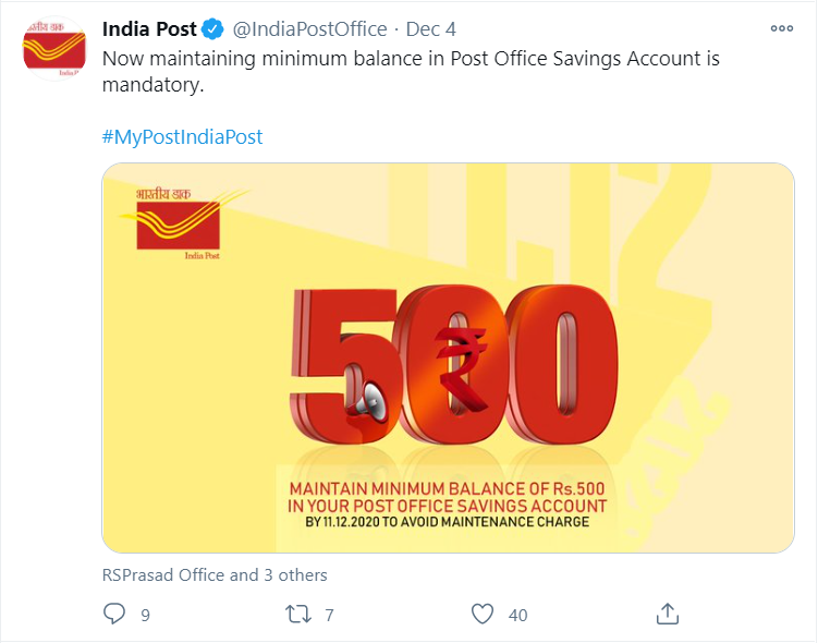ભારતીય પોસ્ટે ટ્વીટમાં લખ્યું છે કે 11-12-2020 પછી પોસ્ટ ઓફિસમાં બચત ખાતા પર રૂપિયા 500નું ઓછામાં આછું બેલેન્સ રાખવું પડશે, મિનિમમ બેલેન્સ નહી હોય તો પોસ્ટ વિભાગ ચાર્જ વસુલી શકશે અને ખાતાધારકે તે ચાર્જ ચુકવવો પડશે. આ ચાર્જિસ રૂપિયા 100 હશે.