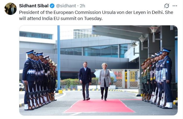 યુરોપિયન યુનિયનના(EU) ટોપ લીડર્સ 26 જાન્યુઆરીના ગણતંત્ર દિવસના કાર્યક્રમમાં ઉપસ્થિત રહેશે, જે પછી ફ્રી ટ્રેડ ડીલની(FTA) જાહેરાત થશે. યુરોપિયન યુનિયનના ટોપ અધિકારીઓ આજે 24 જાન્યુઆરીએ બપોરે ભારત આવી ગયા છે અને અન્ય કેટલાક અધિકારીઓ સાંજે આવશે. યુરોપિયન યુનિયનના અધ્યક્ષ ઉર્સુલા વૉન ડેર લેયેન(European Union President Ursula von der Leyen) આજે બપોરે નવી દિલ્હી આવ્યા છે. તેમજ આજે શનિવાર સાંજે વાગ્યે વિદેશ પ્રધાન ડૉ. એસ જયશંકર તેમની સાથે મુલાકાત કરશે.