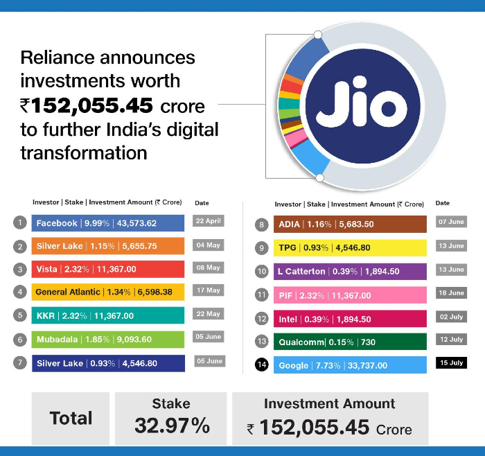 ગૂગલનું જિઓ પ્લેટફોર્મ્સમાં વ્યૂહાત્મક રોકાણકાર તરીકે સ્વાગત છે. આજે, અમે ગૂગલ સાથે બંધનકર્તા કરાર અને રોકાણ કરાર કરવાની જાહેરાત કરી છે, જે અંતર્ગત ગૂગલ રૂ. 33,737 કરોડના રોકાણ સાથે જિઓ પ્લેટફોર્મ્સમાં 7.73 ટકા હિસ્સો ખરીદશે. ગૂગલના આ રોકાણ સાથે, છેલ્લા કેટલાક મહિનાઓમાં જિઓ પ્લેટફોર્મ્સમાં નાણાંકીય અને વ્યૂહાત્મક રોકાણકારોનું કુલ રોકાણ રૂ. 1,52,056 કરોડ થયું છે. એકંદરે, અમે રાઇટ્સ ઇસ્યુ, જિઓ પ્લેટફોર્મ્સના તમામ રોકાણ અને બીપી(BP)માં રોકાણ એમ કુલ મળીને રૂ. 2,12,809 કરોડનું રોકાણ મેળવ્યું છે. નાણાકીય વર્ષ 19-20ના અંતમાં રૂ. 1,61,035 કરોડના ચોખ્ખા દેવા કરતાં આ મૂડી નોંધપાત્ર રીતે વધારે છે અને રિલાયન્સ હવે ખરેખર એક શૂન્ય ચોખ્ખું દેવું ધરાવતી કંપની છે, જે મારા ધ્યેય માર્ચ 2021થી પહેલાંની વાસ્તવિક સ્થિતિ છે.