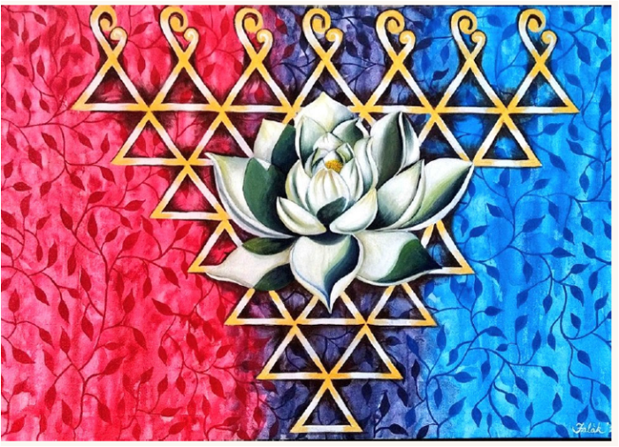 Painting Exhibition in Ahmedabad આપણી અંદર અને સમગ્ર બ્રહ્માંડમાં ઉપસ્થિત સર્જન, વિસર્જન અને સંવર્ધનની શક્તિ એટલે સ્ત્રી ઉર્જા. જેને આપણે દેવી કે માતાના વિવિધ સ્વરૂપે પુંજી છીએ. આ સ્વરૂપોના માનવીય આકારની કલ્પનાને બદલે તંત્ર શાસ્ત્રમાં આ ત્રણ ઊર્જાના સંયોજનને નીચે તરફના ત્રિકોણીય ( યોનિ )  સ્વરૂપે આલકહય છે તે અને શંખ, પદ્મ, શસ્ત્ર વગેરે પ્રતિકોને આધ્યાત્મિક ઉર્જા ચક્રોના રંગ તરંગો સાથે સાંકળીને મારી આંતરિક સ્ફુરણાએ મને જે પ્રેરિત કર્યું એ પ્રસ્તુત કરતી આ ચિત્રમાળા મારા માટે આ દૈવી સ્વરૂપનો રંગ અને આકારો દ્વારા અભિવ્યક્ત કરેલી સ્તુતિ છે, પ્રાર્થના છે.
