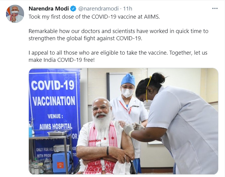 પછી વડાપ્રધાન નરેન્દ્ર મોદીએ કહ્યું કે રાજનેતાઓની ચામડી બહુ જાડી હોય છે. તેમના માટે કોઈ વિશેષ મોટી સોયનો ઉપયોગ તો નથી કરાવાના ને? ત્યારે ત્યાંની નર્સો હસી પડી હતી. અને માહોલ સાવ હળવો થઈ ગયો હતો અને ત્યાર પછી પીએમ મોદીનું રસીકરણ થયું, જ્યારે ટીકાકરણ થયું ત્યારે મોદીએ કહ્યું કે મને તો ખબર જ ના નડી. વેક્સિનેશન દરમિયાન પીએમ મોદી હસતા હતા.