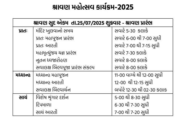 સોમનાથ- શ્રાવણનો પ્રારંભ 25 જુલાઈને શુક્રવારથી થયો છે. પ્રથમ જ્યોતિર્લિંગ દેવાધીદેવ શ્રી સોમનાથ મહાદેવના (Somnath Mahadev first Jyotirlinga in Gujarat) સાનિધ્યમાં શ્રાવણનો 30 દિવસીય શિવોત્સવનો પ્રારંભ તા.25/08/2025-શુક્રવાર થયો છે અને પૂર્ણાહુતી તા.23/08/2025 શ્રાવણ વદ અમાસના રોજ થશે. (Holy Shravan month of Shiva) આ મહિના દરમિયાન સોમનાથ ભજન ભોજન અને ભક્તિનું સંગમ કેન્દ્ર બનશે.(Holy Shravan month begins)