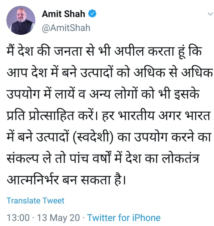 લૉક ડાઉનના સમયમાં તમે બધાં ઘરના કામ કરતાં થઈ ગયાં, રસોઈ બનાવતાં શીખી ગયાં હશો. પત્નીને ઘરકામમાં મદદ કરી હશે. આવી જ રીતે દેશ માટે હવે તમારે આત્મનિર્ભર બનવાનું છે. બીજા દેશોમાંથી આયત થતી ચીજવસ્તુઓનું ઉત્પાદન ભારતમાં જ કરવાનું. ભારત ચીનથી જે આયાત કરે છે, તે બંધ કરીને તેનું ઉત્પાદન ભારતમાં કરવું જોઈએ, તો જ ભારત આત્મનિર્ભર બન્યું કહેવાશે. આ દિશામાં વિચારવા માટે જ પીએમ મોદીએ દેશવાસીઓને સંદેશ આપ્યો છે. કેન્દ્રીય ગૃહપ્રધાન અમિત શાહે પણ ટ્વીટ કરીને દેશની જનતાને સ્વદેશી અપનાવવાની અપીલ કરી હતી.