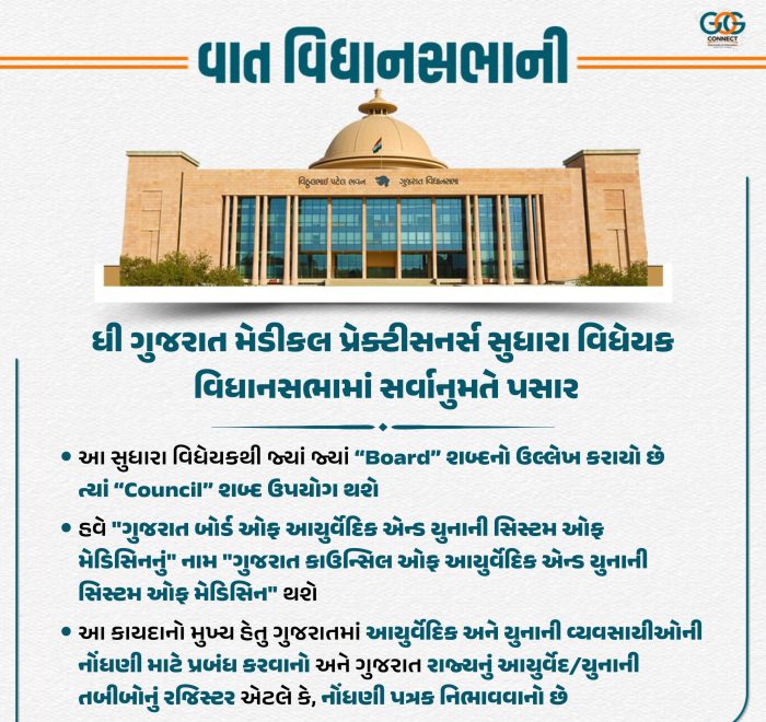 આજે આ સુધારા વિધેયક પસાર થતા નોટીફિકેશન દ્રારા રાજ્યની આરોગ્ય સંસ્થાઓને કામચલાઉ રજિસ્ટ્રેશન માટેની અરજી કરવા માટેનો સમય સાત માસ એટલે કે તારીખ 30-04-2026 સુધી વધારવામાં આવશે. આ સુધારા વિધેયક સંદર્ભે ગૃહના વિવિધ સભ્યોએ વિગતવાર ચર્ચા કરી હતી અને ચર્ચાના અંતે આ વિધેયકને બહુમતીથી પસાર કરવામાં આવ્યું હતું.