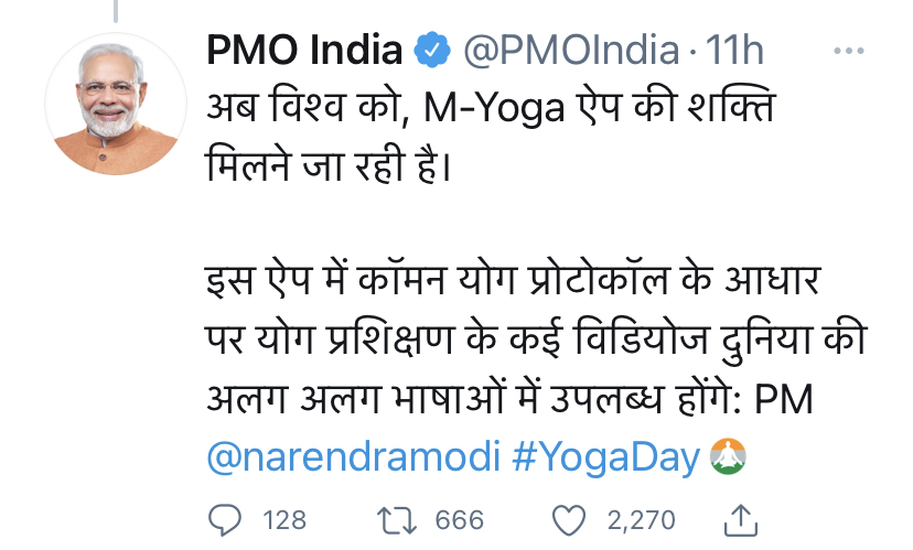 વડાપ્રધાન મોદીએ આજે સોમવારે આંતરરાષ્ટ્રીય યોગા દિવસે જાહેરાત કરી હતી કે ભારત અને વિશ્વ આરોગ્ય સંસ્થા WHO એ આજે એક મહત્વપૂર્ણ પગલું ભર્યું છે. વિશ્વને આજે એમ-યોગા એપ ( M-YOGA APP ) મળશે, જે એપ સામાન્ય યોગના આસનો આધારિત યોગ તાલીમના ઘણા વીડિયો પૂરા પાડશે અને તે ઘણી બધી ભાષાઓમાં ઉપલબ્ધ રહેશે