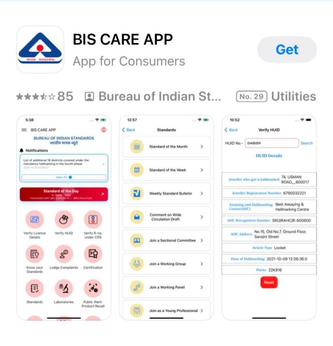 ભારતમાં વેચાતાં સોનાના દાગીના પર છ અંકોનો એક યુનિક કોડ હૉલમાર્ક યુનિક આઈડેંટિફિકેશન (HUD) જરૂર હોવું જોઈએ. આ કામ ભારત સરકારની સંસ્થા બ્યૂરો ઓફ ઈન્ડિયન સ્ટેંડર્ડ્સ (BIS) કરે છે. તે સોનાની તપાસ કરે છે અને પછી હૉલમાર્ક આપે છે. સવાલ એ છે કે આ અસલી હૉલમાર્કને કેવી રીતે ઓળખવો. તેના માટે BIS એ એપલ એપ સ્ટોર ( Apple App Store ) અને ગુગલ પ્લે સ્ટોર ( Google Play Store ) પર BIS CARE નામની એક એપ બનાવી છે. તેનો ઉપયોગ ખૂબ જ સરળ છે. દાગીના પર છપાયેલ HUID નંબર એપમાં નાંખવાથી તુરંત ખબર પડશે કે દાગીનો અસલી છે કે નકલી…