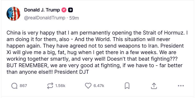 US China News ટ્રમ્પે ટ્રુથ સોશિયલ પર લખ્યું છે કે, “ચીન આ વાતથી ખૂબ જ ખુશ થશે કે મેં સ્ટ્રેટ ઓફ હોર્મુઝને હમેશા માટે ખોલી રહ્યો છું. હું આ તેમના માટે પણ કરી રહ્યો છું અને પુરી દુનિયા માટે પણ. આવી સ્થિતિ ફરીથી કયારેય નહી આવે. તેઓ આ વાત પર સહમત થયા છે કે તેઓ ઈરાનને હથિયાર નહી મોકલે. જ્યારે હું કેટલાક સપ્તાહ પછી ત્યાં પહોંચીશ તો રાષ્ટ્રપતિ શી જિનપિંગ મને ખૂબ જોરથી ગળે મળશે. અમે સાથે મળીને ખૂબ સમજદારીથી અને ખૂબ સારી રીતે કામ કરી રહ્યા છીએ. શું આ લડાઈ ઝગડાથી વધુ સારું નથી? પણ એ યાદ રાખવું જોઈએ તો જો જરૂર પડશે તો અમે લડાઈમાં ખૂબ જ પાવરધા છીએ, અન્ય લોકો કરતા પણ વધુ સારી રીતે!!! રાષ્ટ્રપતિ ડીજેટી”
