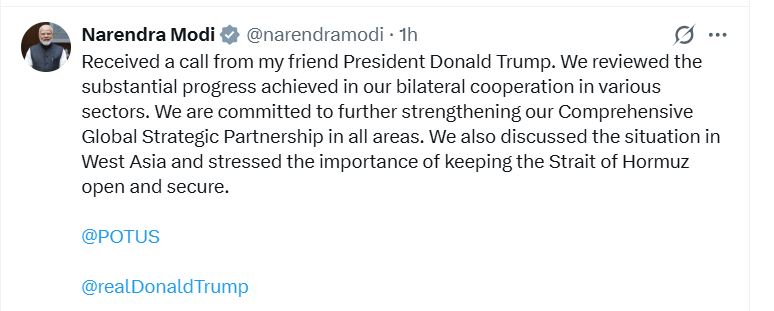 પીએમ મોદીએ એક્સ પર લખ્યું છે કે, “મારા મિત્ર રાષ્ટ્રપતિ ડોનાલ્ડ ટ્રમ્પનો ફોન આવ્યો હતો. અમે વિભિન્ન ક્ષેત્રોમાં અમારી દ્વિપક્ષીય સહયોગમાં થયેલી મહત્ત્વપૂર્ણ પ્રગતિની સમીક્ષા કરી હતી. અમે તમામ ક્ષેત્રોમાં વ્યાપક વૈશ્વિક રણનીતિ ભાગદારીને વધુ મજબૂત કરવા માટે પ્રતિબદ્ધ છે. અમે પશ્ચિમ એશિયાની સ્થિતિ પર પણ ચર્ચા કરી હતી અને હોર્મુઝ સ્ટ્રેટને ખોલવા અને સુરક્ષિત રાખવાના મહત્ત્વ પર પર ભાર આપ્યો છે.”